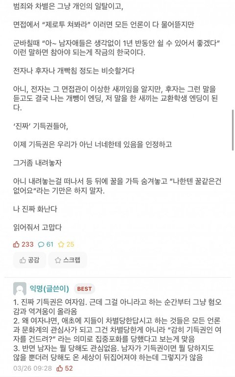성차별 당하면 사람들이 지지해 준다고? 그게 뭔 차별이냐고 한국에 요즘 성차별이 어디 있냐고 비웃는 남자가 태반인데 뭔소리야. 뉴스도 안 보고 사나. 서울대생이 저 정도라니 세상 잘 돌아가네?
