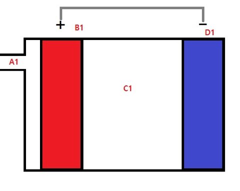 충전된 전지를 사용하면 D1의 있던 전자가 회석 전선을 통해 B1으로 흐르면서,