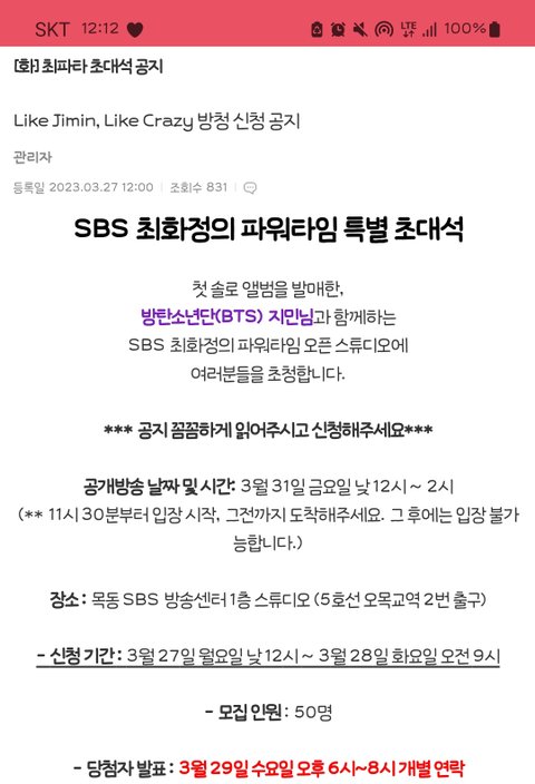 31일에 오픈 스튜디오로 한다는데 50명 방청객 모집한대 아미소녀들 많이 가라 방청신청 ㄱㄱ