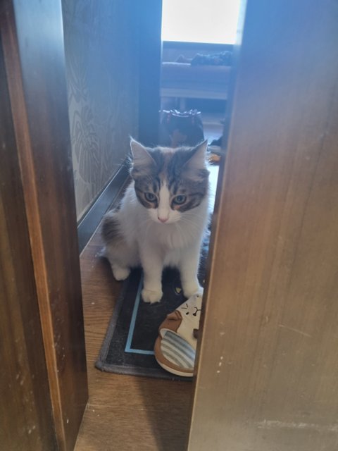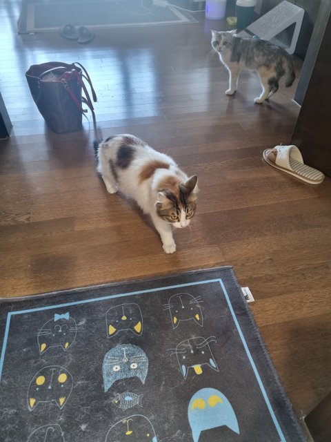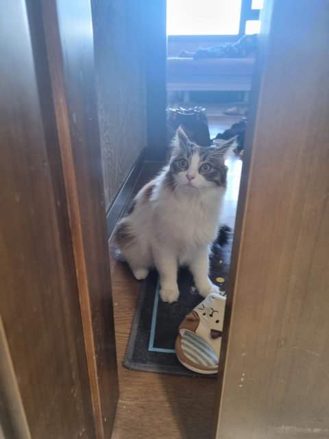 그리고는 이제 베리는 점점 대담해져서 아침에 욕실에서 씻으면 발매트 앞에서 지켜보고 있어요. 대부분 냥이들이 그러하듯 베리도 화장실이 궁금한가봐요~ 아직 사람을 무서워 하면서도 1주일에 반 이상 항상 욕실 앞 발매트에 있어요.