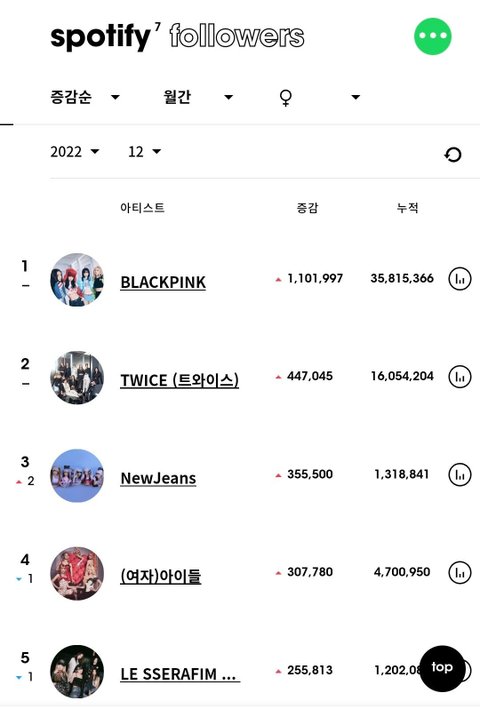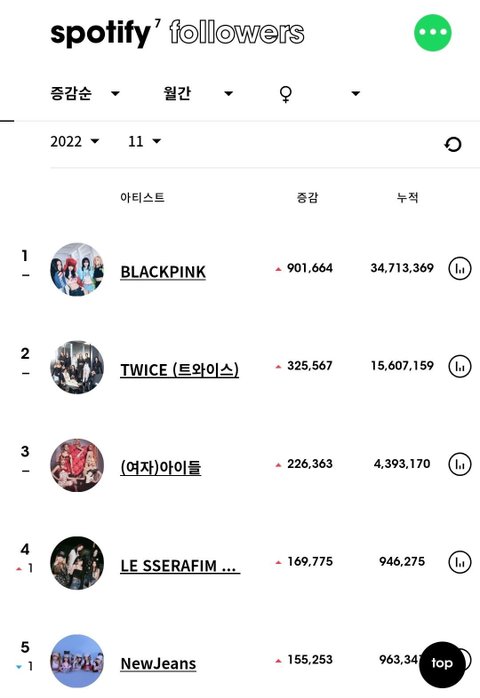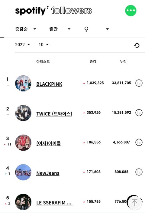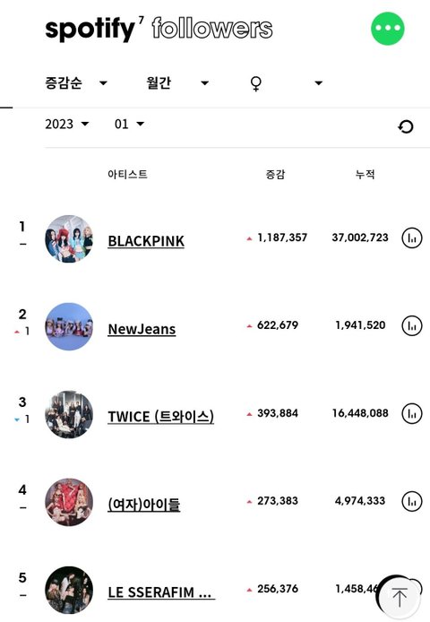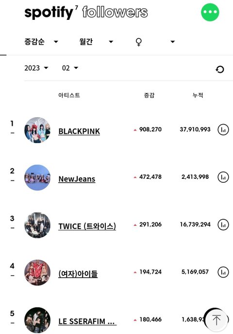 최근 5개월간 여돌 스포티파이 팔로워 월간 증가량 top5