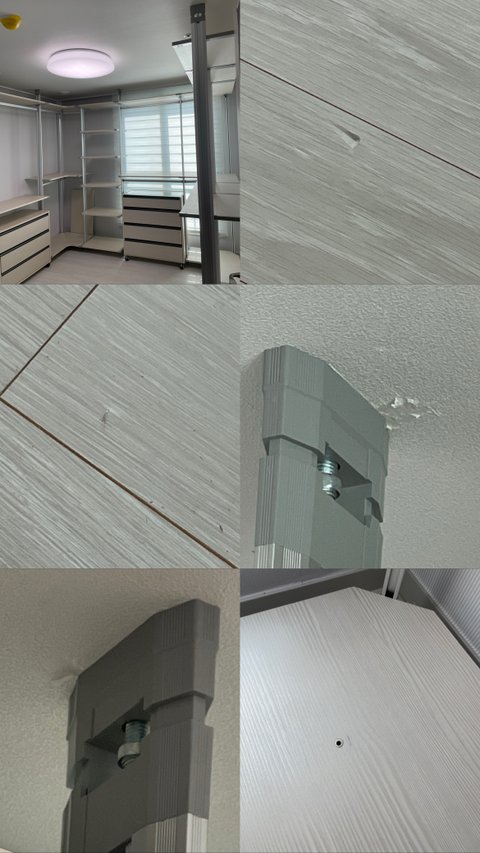 구멍난 선반 바꾸시면서 출고 될때 공장에서 다 뚫려 나오는 거라고 하시고 (반대편 같은 모양은 안뚫려 있음)벽지랑 바닥 보시고 별 대수롭지 않게 여기시더라구요.