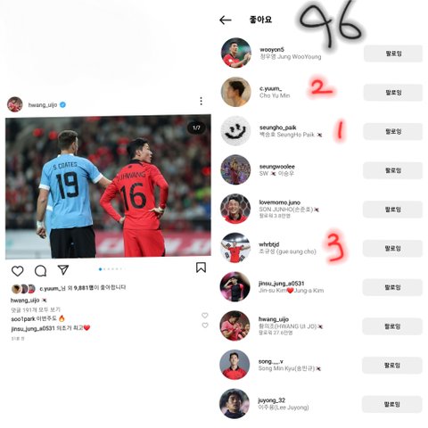 (1.조규성이 어제 손흥민 게시물에는 좋아요 안누르고 김민재 꺼만 좋아요 누른건 팩트. 2.다음날 황의조,김태환 글에는 좋아요 누른거 팩트. 3.끝까지 손흥민꺼에만 좋아요 안누른건 팩트.ㅡ 유독 발악하는 조규성 팬들아 조규성 까려고 올린게 아니라 이번 사건만 보자면 팩트를 올린거야.)