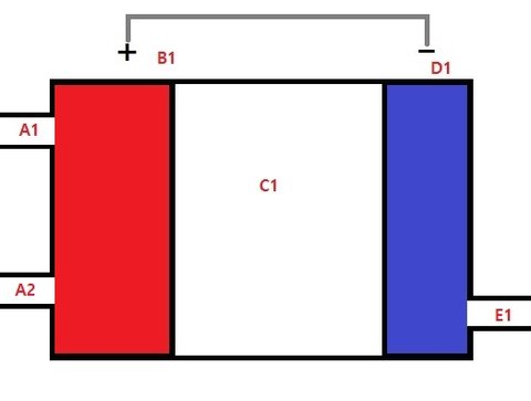 양극재 B1과 음극재 D1을 회색 전선으로 이으면 전류의 흐름이 발생하기 시작하는데,