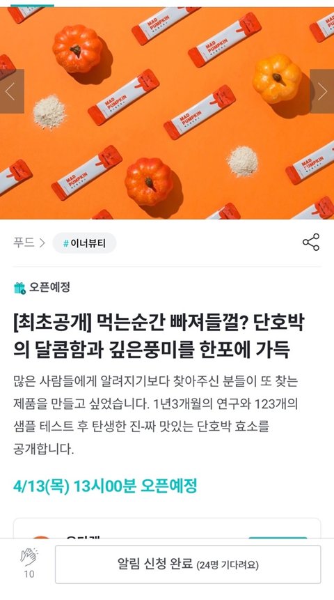 안녕하세요:)저희 매드펌킨효소 와디즈 런칭 기념 이벤트를 하고 있습니다.알림신청 눌러주시고 매드펌킨효소 1BOX씩 받아가세요^^