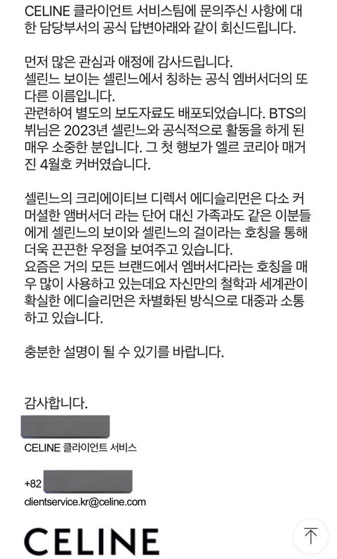 +방탄 뷔에 대한 셀린느 담당부서의 공식답변 공계에 공식 올라옴