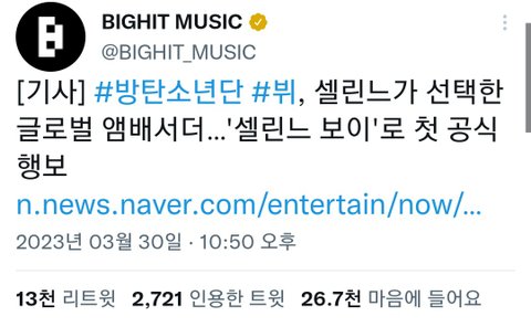 빅히트 참 뻔뻔하네 첫 공식행보는 어제 포토월이 아니라 엘르화본데 일주일이나 지나서 저따위 기사를 리트윗하다니