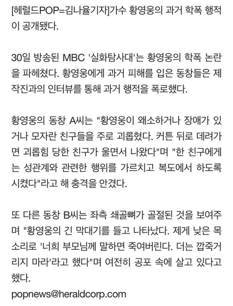 황영웅 팬들이 더 문제임... 꼭 귀신 씌운사람마냥 황영웅 감싸고 돌고있음... 미쳐도 단단히 미침... 피해자 신상 까라고 2차 가해중임... 그 가수에 그 팬임...