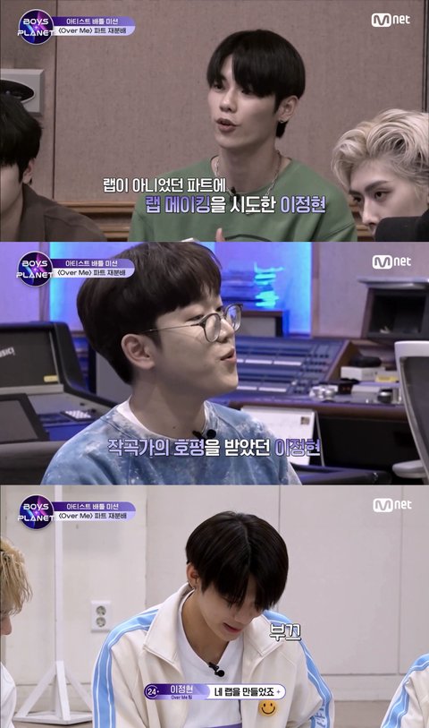 분명 2차때까지 노래 실력 보여준 적 없었는데 생각보다 노래를 너무 잘함 결국 랩과 보컬 두마리 다 잡으며 당당하게 오버미 파트 지키는 이정현 연습생 ㅇㅇ 1절, 2절 도입부를 다 맡게 됨