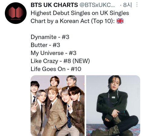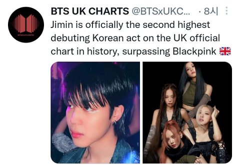 UK 싱글차트 방탄 다음으로 높은 순위래