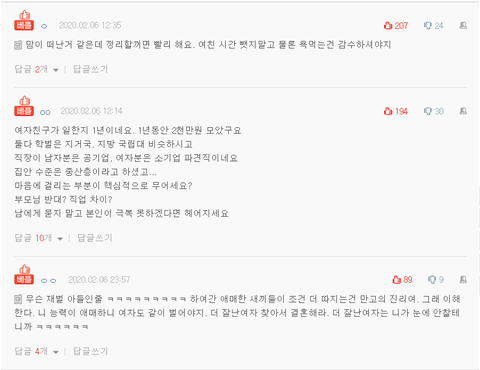 말투가 주작같다는데 딱히 할말이 없네요. 구구절절 쓰기싫었고 핵심만 짧게 적으려다보니 제목부터 말투까지 오해를 많이 산것같습니다. 아무튼 결론은 최근 판에서 집안 경제력 차이나는 남친과 결혼을 해야하나등의 글을 많이 봤고 전부 여자분들이 쓰신글이라 저같은 경험 하지않으셨음 좋겠다는 취지로 쓴글이에요. 부자를 만나라도 아니고 경제조건 비슷한 집안끼리 만나세요.