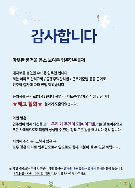 쓰니님께서 발벗고 나서주신덕에 모두들 힘을 모아 이겨냈습니다:-) 아저씨의 얼굴이 어두웠었는데 밝아지셔서 너무 좋네요 저도 관리사무소측입장문보고 너무나 어이가없어서 화가났지만 그래도 좋은결과가 있으니.. 앞으로 더 나아가서 해쳐나가야할것들이 많이 있을테니 저도 힘을 보탤수있다면 보태겠습니다 해당아파트 주민분들 그리고 전국각지역에 계신분들 힘을 합쳐주셔서감사합니다