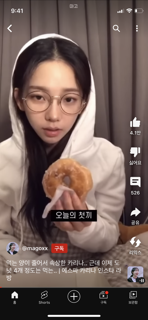 유튜브에서 카리나가 크리스피 딱 4개먹는거 봤었는데