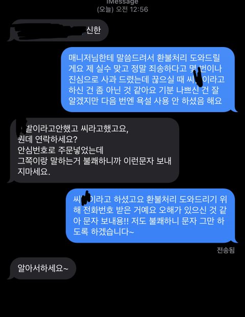 연신 죄송하다 진심으로 말했고 다음번에 더 챙겨드리겠다 라고 말도 했는데 욕처먹으니까 기분이 안 좋은 거야 사과 진짜 열번은 더 함 안 그래도 바빠 죽겠는데 그래서 환불 처리 도와드리겠다 하면서 다음 번엔 욕설 안 하셨음 좋겠다 라고 문자 보냈는데 뭔데 문자 보내냐 이래갖고 오해한 것 같애서 다시 한 번 문자 보냈어
