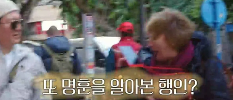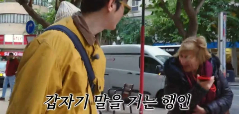 명훈을 유심히 쳐다보다 말을 거는 행인