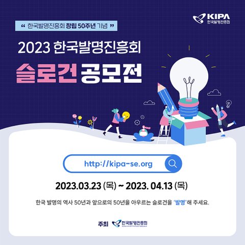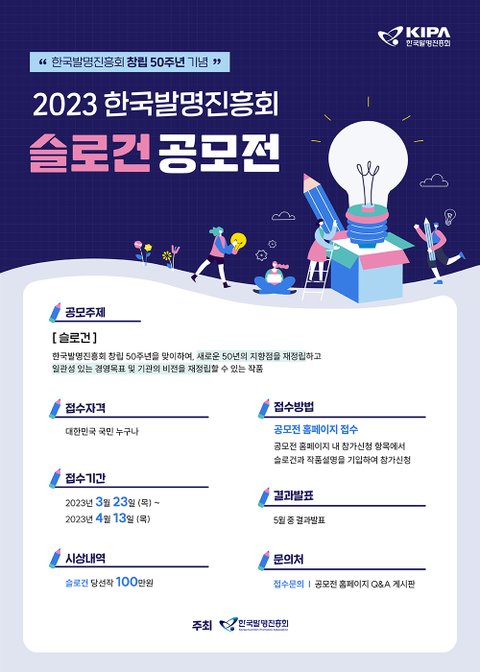 접수 기간 : 2023.03.23. (목) ~ 2023.04.13. (목)당선작 발표 : 2023년 5월 중 (한국발명진흥회 홈페이지, SNS 등 게재 및 개별 통보)지원 자격 : 누구나지원 방법 : 공모전 전용 홈페이지(http://kipa-se.org)로 제출시상 내역 : (1명) : 상금 1,000,000 원