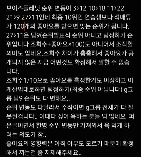 좋아요 숨기는거 부터 수상한데 니들 도 아직 모르잖아 게다가 원본 글 쓰니가 G그룹 전원 다 수상한거 이미 말했어고 근데 석매튜가 분량 제일 많고 비주얼 픽으로 나오고 등 그걸 때문에 욕먹게 된거야... 이제까지 주제 선택짓 하는것 같아... 문제가 저거뿐만 아닌데