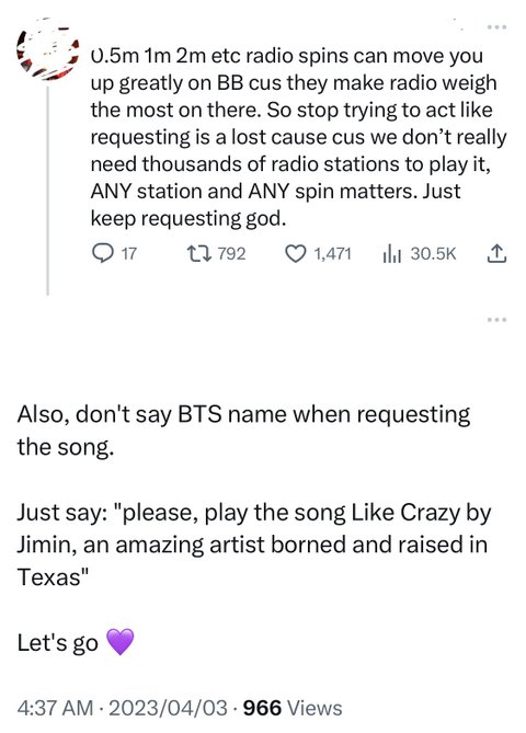 외랑이들 요즘 라디오 신청할때 일부러 bts라고 안 한대 팁으로 텍사스에서 나고 자란 지민 노래 틀어달라고 하면 틀어줄지도 모른다고 하더라ㅋㅋㅋㅋ 근데 이 상황에서 1위라니ㅠㅠㅠ