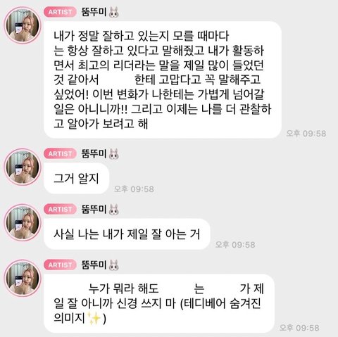 소속사에서 수민이 1명에게 리더의 짐을 지우지 않게 하는 게 좋겠다고 판단했다고 함.