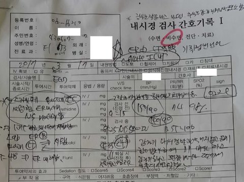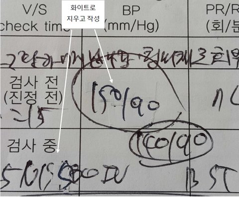 건강검진 병원의 내시경 검사 간호기록 I 의무기록(밑에 첨부)이 조작되었습니다. 첫째 담당 간호사가 검사 전(진정 전) 9:15 혈압 150/90, 맥박 74, 산소포화도 98%로 회복실 이동 후 22분 지난 9시 15분 측정했다고 주장하는데 CCTV에서는 이동식 수은 혈압계로 혈압만 측정하는 모습만 보이며, 심지어 화이트로 지우고 혈압을 기록 했습니다. 둘째 담당 간호사는 검사 중 혈압 140/90은 9시 15분 1차 혈압 측정 후 5분 후에 다시 2차 측정한 혈압이라고 주장하지만 CCTV 확인결과 2회 측정한 사실이 없습니다. 셋째 회복실 이동 사유가 ①환자 어지럽다 함 침대채로 회복실 이동 ②갑자기 내시경 발관 후 어지럽고 몸에 힘이 없다 하여 BP check하고 갑자기 토하고 왼쪽 마비 떨어져 주치의 얘기함 ③검사는 잘 끝나고 나오심, 휴식 후 갑자기 머리 아픔 호소함 3회에 걸쳐 기록이 되어 있으며 서로 내용이 상이 합니다. 이런 의무기록을 믿을 수 있겠습니까?