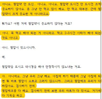 내시경 검사 의사는 검사를 스무스하게 했으니 내시경 사진 확인해라, 혈압약을 드시건 안 드시건 중요하지 않고, 꼭 먹고 해야 되는거 아니고, 우리는 그냥 한다, 아침에 혈압 오르는거 아니다, 검사 전에 우리 혈압체크 다 하고 차트에 기록 다 한다며 담당 간호사와 검사 전, 후 혈압체크 다 한다며 큰소리치며 검사실에서는 문제가 없었고 회복실에 뇌출혈이 발생했다고 주장합니다. (녹취록 사진)