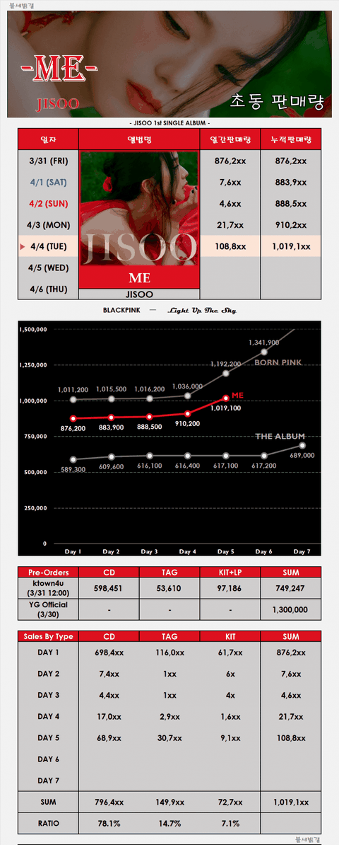 전세계에서 일주일만에 100만장 이상 판매한 여자 솔로 가수는 아델, 테일러 스위프트, 지수 뿐이라고 함!!