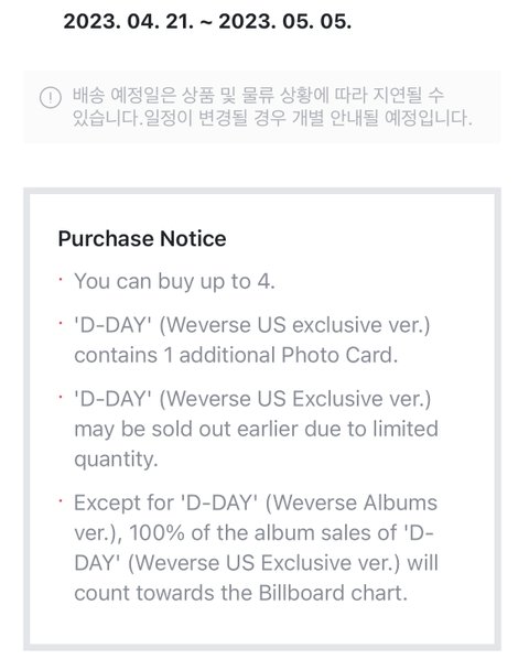 그 us샵 들어가서 확인한 쓰니인데 보니까 위버스버전은 빌보드 처트 집계가 안되나봄 이건 빌보드 정책이라 어쩔수없는듯…그래서 따로 배송하는듯 일단 빌보드 집계되는 일반버전 두개부터 먼저 배송하고 5월달에 위버습앨범 배송인가봐