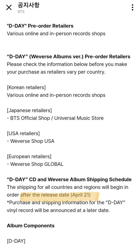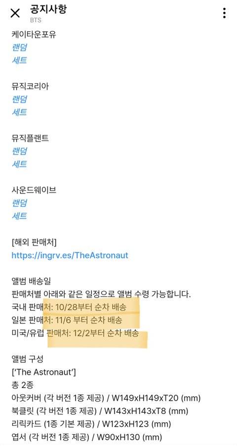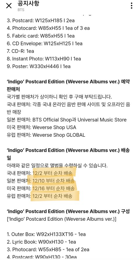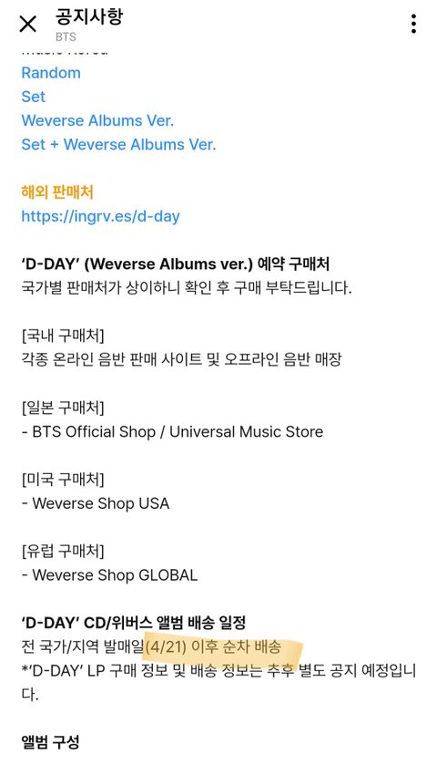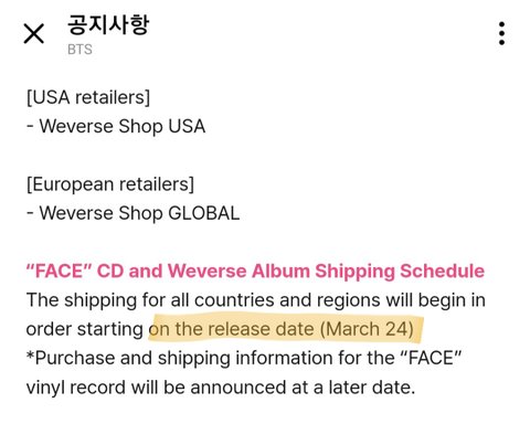 남주니랑 석진이 삼단배송이야 이미 유명한데 특히 남주니 날짜 최소 15일 정도 차이남 석지니는 일주일 호비는 실물 앨범도 안 나왔었고 윤기는 발매일 이후 순차 배송 지민이는 발매일 순차 배송임 윤기랑 지민이 영어 공지도 가져옴 한글영어 공지 둘이 묘하게 차이나는거 보이지? 얘네 진짜 뭐하냐
