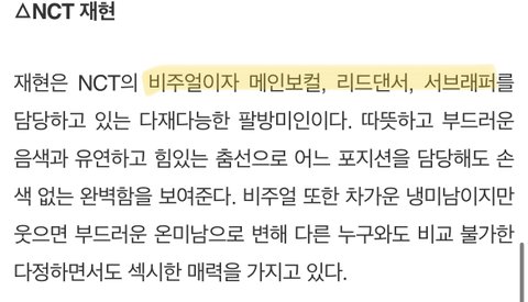 SM은 좋겠다 비주얼에 중저음음역대폭넓은메보 댄서들도 잘춘단 리댄 근데도 랩까지 가능한 키180 올라운더 다되는 멤버 갖고 있으니까.. 재현한테 잘해라
