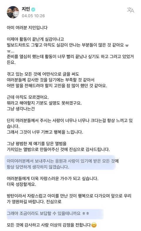 방탄 지민 활동 끝내고 오늘 글 올렸는데