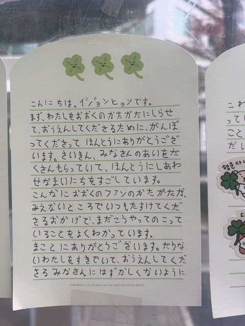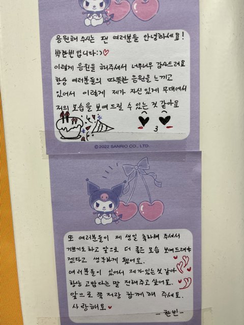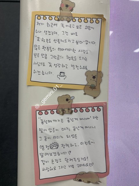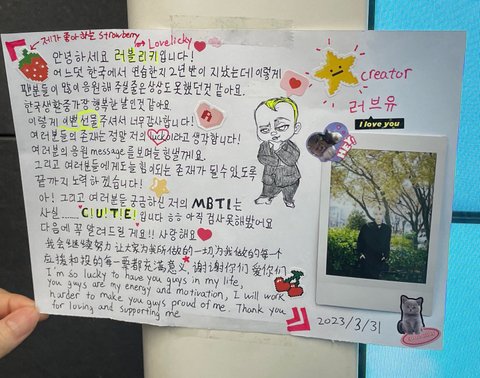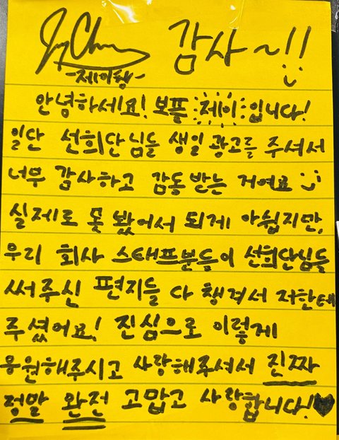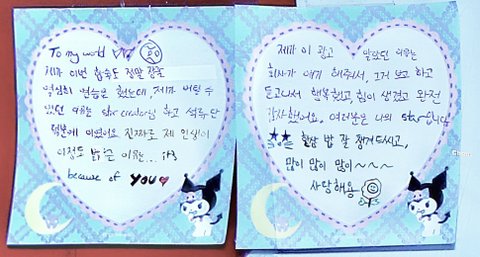 유승언 리키 둘이 다꾸하듯이 쓴거 너무 구ㅏ엽고ㅋㅋㅋ 해외멤들도 두 장 이상 써준 애들도 있는게 감동임ㅋㅋㅜ +금준현 편지 읽는게 제일 재밌었음ㅋㅋㅋㅜ