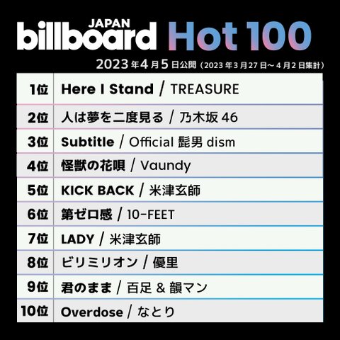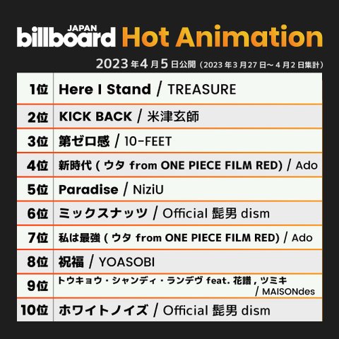 트레저 애니메이션 ost로 빌보드 재팬 핫100 1위함