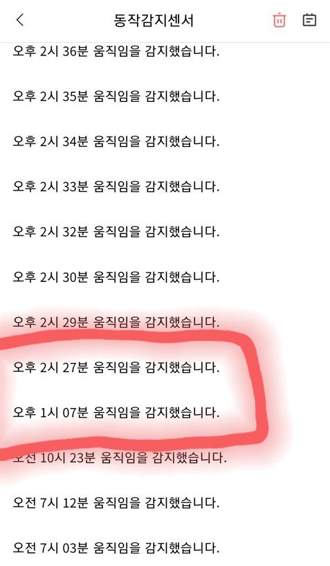 아이는 저희 출근시간인 오전 7시경, 그리고 10시경, 그 이후 1시쯤 도착한 택배기사 소리에 움직인 기록이 남아있고 그 이후 2시 27분경 부터 2시 54분 까지의 수많은 기록들이 남아 있었습니다.
