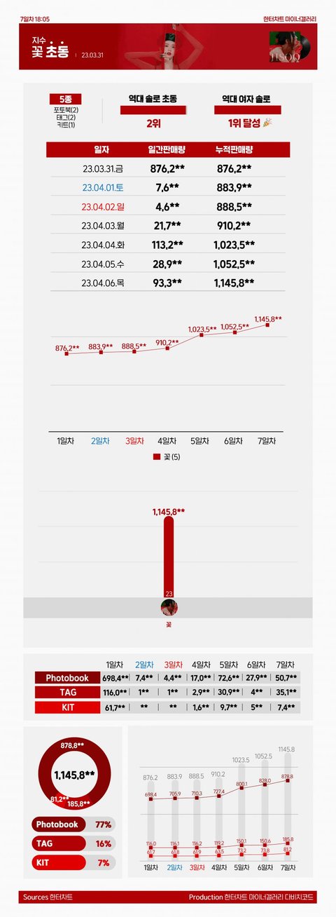 초동 114만장 - kpop 여자 솔로 1위, 여자 가수 2위 (1위는 블랙핑크) , kpop 솔로 2위 (1위는 지민 145만장)