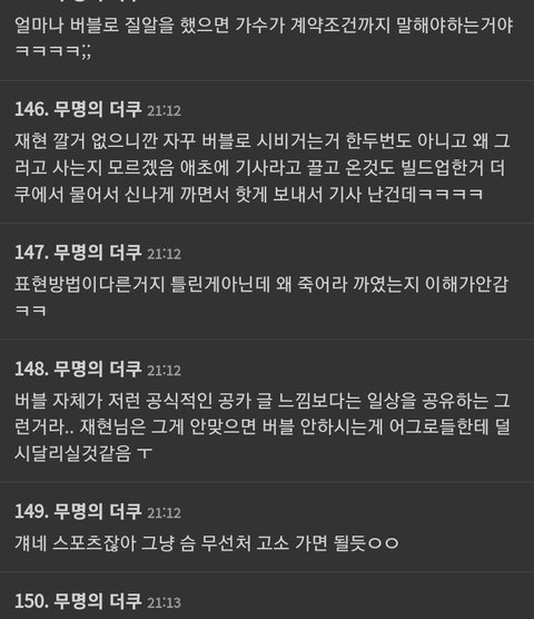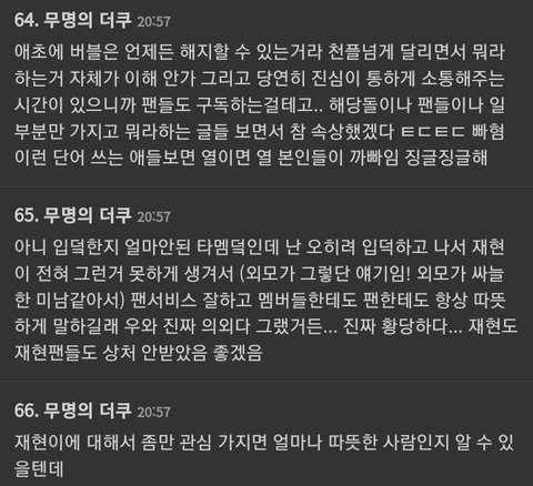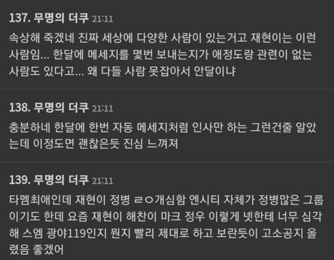 또 재현글마다 까는 베댓조작하는 애 옴 본인피셜 남돌들 ㅈㄴ 까고 다녔고 자기가 아이디 300개 넘는다함 갤용어로 저러고 삼 저 댓글 캡쳐도 재현글 댓글 아니고 다른글 댓인데 우김 그냥 베댓 무시해줘