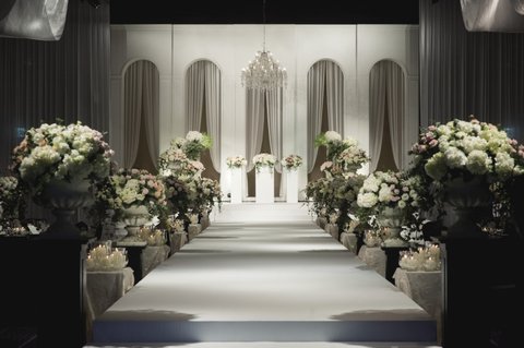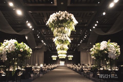 서울 인터컨티넨탈 파르나스 호텔의 그랜드볼룸.예식 진행 대관 비용 2천만원대. 기본 무대 장식(500만원대) 및 기본 꽃장식 (1700만원대) 시작.결혼식장에만 최소 5천만원~1억 들었을 것으로 추정.