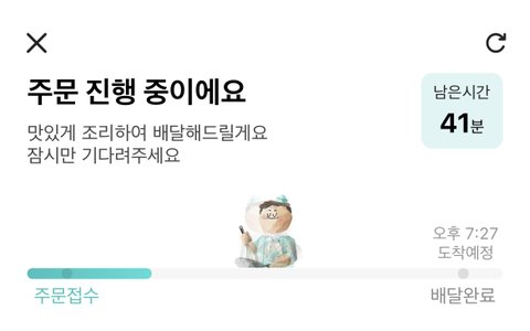 주문하기 전에는 21~36분이여서 ㅇㅋ 빨리 오겟군 하고 주문했는데 실제로 찍힌 시간은 51분임 뭐가 맞는 거냐?? 사진은 내가 10분 기다리다가 캡한 거라 41분으로 뜨는거