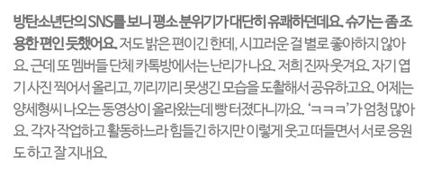 단체 카톡방에 ㅋㅋㅋㅋㅋ가 엄청 많은 슈스 아이돌 어떰? 진짜 서로에게 힘이 되는 존재들 같고 서로 응원하는 분위기 저 글만 봐도 어떤 느낌인지 알 것 같아서 나까지 기운나는 것 같음 우리랑 다 백프로 공유할 수 없어도 얘네 관계성으로 궁예하거나 까는건 진짜 의미없음 소년단이랑 공유하고 싶은건 유튜브 알고리즘 뿐임ㅋㅋㅋㅋㅋ 웃긴거 나도 보여줘 멤버들 노는데에 나도 끼고싶다 진심 아 몽글몽글해ㅜㅜ 사랑해 방탄
