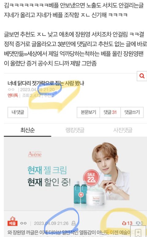 동정영업 수치스럽다 글올라온지 3분만에 댓달고 추천도 없는거 바로 베댓 만들고 자해공갈 영업하기 이러고 나중에 장원영은 치킨 닭다리 젓가락으로 먹었다고 까임ㄷㄷㄷ이러려는 정치질 바이럴