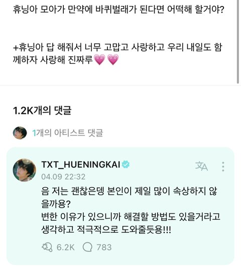 우선 어그로 죄송함 요즘 유행하는 바퀴벌레 밈 있잖아 어떤 팬이 투바투 휴닝카이한테 물어봤는데
