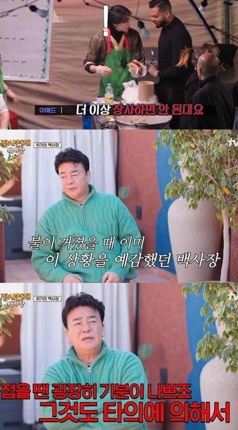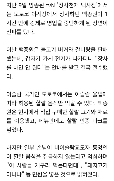 모로코 야시장에서 장사하는데 생각보다 장사가 잘 되니까 야시장 관계자들이 장사 시작한 지 1시간도 안돼서 전기 꺼버리고 식당으로 손님들 못 들어오게 펜스까지 침