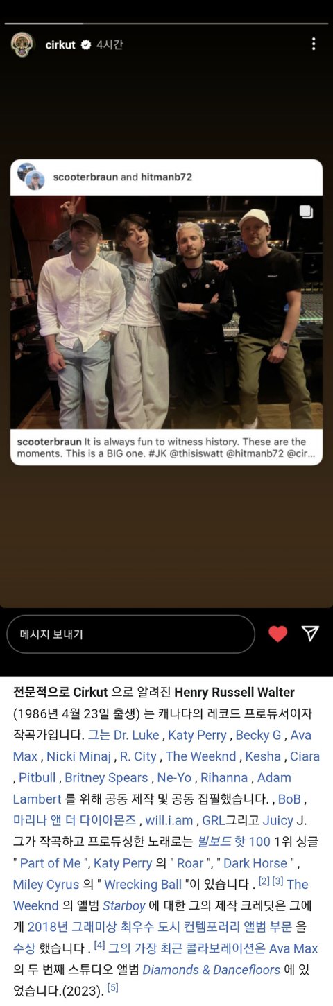 cirkut 이분도 어마무시한 분인데 정국이랑 인증사진 인스스에 올리심 뭔가 엄청난게 오고 있긴 한듯