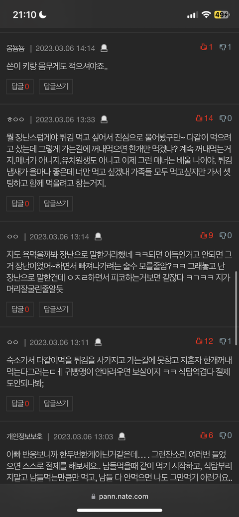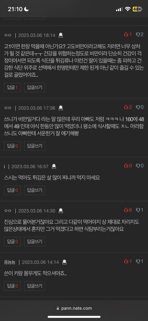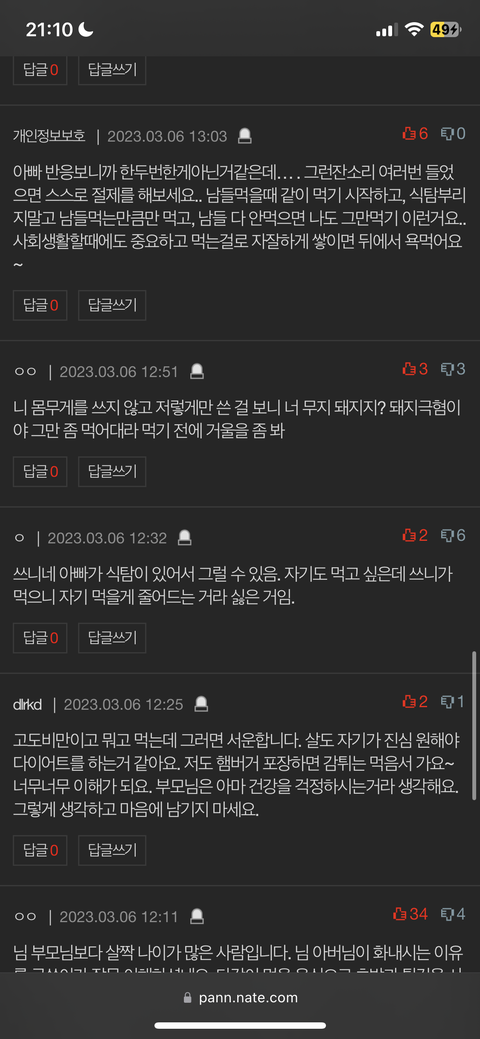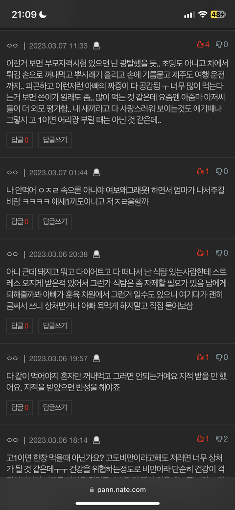 그리고, 댓글로 글쓴이 돼지일 듯, 글 쓴 거 같잖다, 그만 쳐먹어라, 먹기 전에 거울 좀 봐라, 체중 못밝힐 정도로 조카 돼지인 듯 이라고 댓글 다신 분들은 얼마나 떳떳하신지는 모르겠지만 아무리 남이라고 해도 인신공격은 조금 아닌 것 같습니다. 혹시 제가 잘못 생각했다면 댓글 달아주세요.