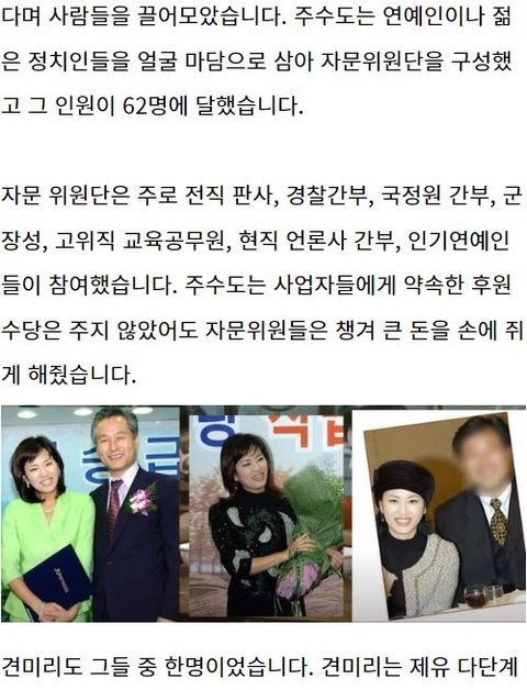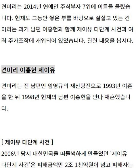 한 마디로 연예계 어슬렁 거리던 전문 주가조작범 보타바이오 관련 허위공시(홍콩에서 거액 투자 받았다 보타바이오란 회사가 발명한 줄기세포치료제에 투자했다 등 이건 검색하면 당시 기사 찾을 수 있음 웃긴 게 당시 보타바이오 최대 주주 견미리 글고 해당 치료제는 현재 없음)로 1심 유죄 2심 무죄 받음 회사 살리려고 노오오력 했다는 생뚱 맞은 이유로 항소심에서 무죄 판결 받음 문제는 허위공시인데..당시 변호인단의 정체가 궁금 암튼 대법원 판결 기다리는 중 견미리는 보타바이오 허위공시 항소심 무죄 이거 하나 가지고 본인도 피해자다 이러는 중 제이유 다단계, 로이, 보타바이오 유상증자에 대해서는 함구 중