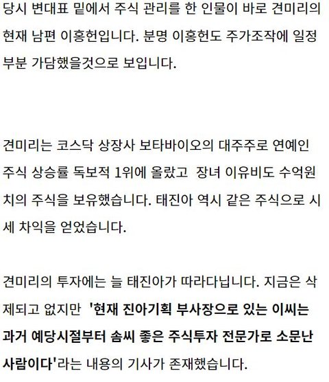 90년대말 2000년대 중반까지 견미리가 방송 나와서 주식 얘기 많이 했어요 지 주변 온갖 연예인들 다 끌어드렸고 투자 엄청 권했어요 일개 시청자였던 나도 기억하는데 시간 좀 지났다고 손바닥으로 하늘을 가리려 하네요