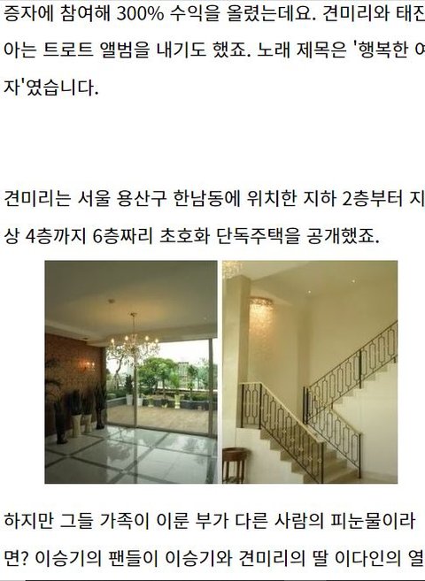 견미리가 90년대 잘 나가긴 했지만 시대를 풍미했던 청춘 스타급은 절대 아니었어요 걍 A에서 B급 사이 정도? cf 몇번 찍은 정도 것도 첫번째 남편이 돈 탕진하면서 90년대 후반에 지금 남편 만날 때만 해도 돈 별로 없었다고 해요 배우로서 활발히 활동 못한게 벌써 20년도 넘었는데 지금 한남동 100억대 집에 살고 돈 펑펑 쓰고 딸 초호화 결혼식 해줄 만큼의 부를 누릴 사람이 아님 이런 막대한 부 어떻게 축적했는지 당당하면 밝히면 되는데 왜 못하는지 걍 피해자라고만 주장하는 게 말이 안됨 피해자면 본인도 돈이 없어야 되는데 엄청 많음