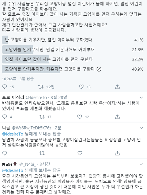 난 오히려 자기 반려동물 버리고 옆집 애 구한다는 사람을 비판하고 싶음. 애초에 반려동물로 키운다는 것도 본인 선택이고 그 반려동물의 의사와는 관계 없이 데려와 키우면서 위험으로부터 보호도 하지 않고 생명도 책임지지 않는다? 그건 굉장히 무책임한 거라고 생각함. 마치 부모가 아이를 낳아두고 방임, 학대하는 것과 다름이 없다. 가족으로 삼았으면 그 아이 생의 마감까지 안전하게 책임져줄 의무가 있고 행복하게 해줄 필요가 있다.