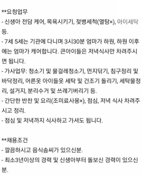 가사도우미, 산후도우미, 청소도우미 최소 3명이 할 일을 1명으로 비벼보려는 것 같은데요? 저 정도 업무강도일 하다가 병원비가 더 나올듯요. 해도해도 너무하는것 같네요