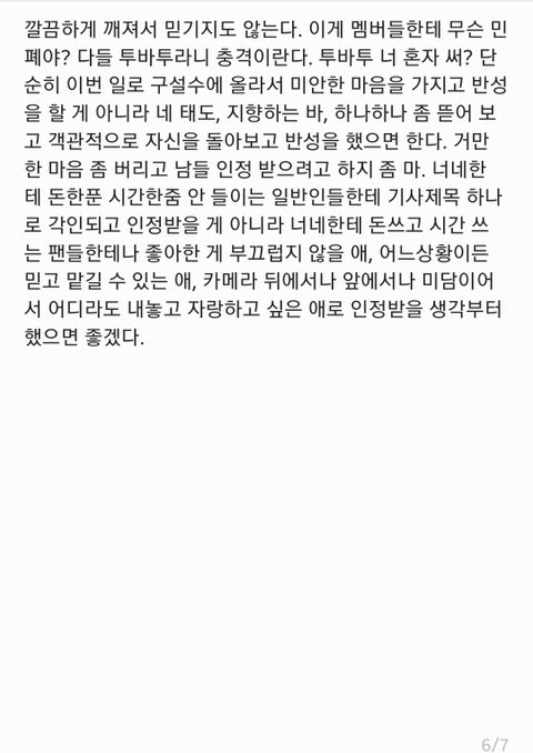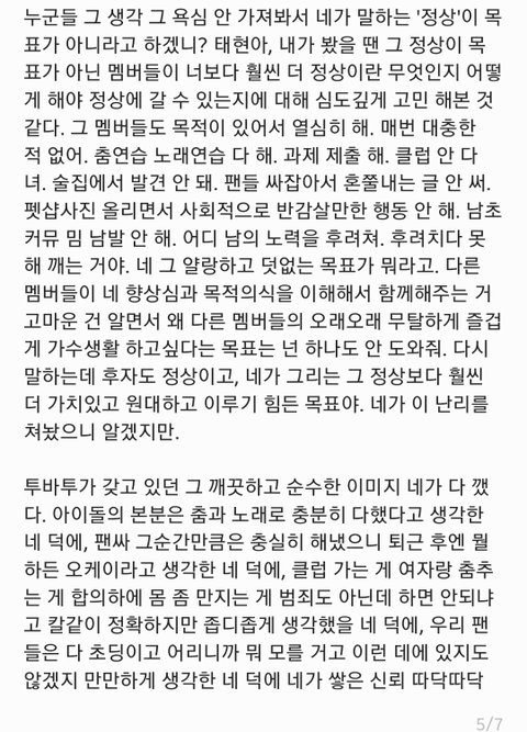 '누군들 그 생각 그 욕심 안 가져봐서 네가 말하는 '정상'이 목표가 아니라고 하겠니? 태현아, 내가 봤을 땐 그 정상이 목표가 아닌 멤버들이 너보다 훨씬 더 정상이란 무엇인지, 어떻게 해야 갈 수 있는지에 대해 심도깊게 고민 해본 것 같다. 어디 남의 노력을 후려쳐. 네 그 알량하고 덧없는 목표가 뭐라고. 다른 멤버들이 네 향상심과 목적의식을 함께해주는 게 고마운 거란건 알면서 왜 다른 멤버들의 오래오래 무탈하게 즐겁게 가수생활 하고 싶다는 목표는 넌 하나도 안 도와줘.'