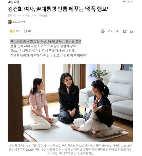 김 여사는 전날에는 경기도 파주 국립 6·25전쟁납북자기념관에서 납북자·억류자 가족들을 만나 위로의 뜻을 전했다.